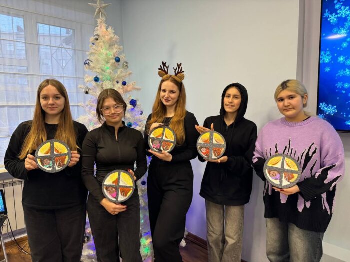 Вооружившись кистями и красками, юным художницам предстояло попробовать свои силы в рисовании на круглом холсте с толстым подрамником. Необычный формат холста позволил создать самое настоящее окошко, украшенное гирляндами. А в этом окне, облокотившись на подоконник, ждал новогоднего чуда симпатичный ежик в свитере. 🧣