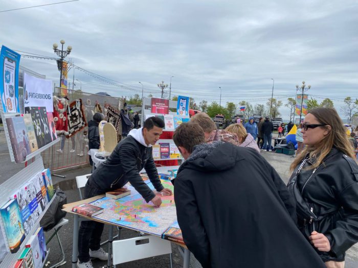 25 июня – в День молодежи на Магаданской площади прошел праздничный Арбат-фестиваль «Территория молодых», на котором для колымчан развернули более 30 культурно-развлекательных и образовательных площадок. Юношеская не смогла пройти мимо такого яркого летнего события и подготовила интересные игры для жителей города разных возрастов. Проверить свои знания русских народных сказок, народных игр и забав, ремёсел, русской кухни и национального костюма смог любой желающий в фолк-путешествии «В некотором царстве… или отыщи то, не знаю что». Это не просто игра – это настоящее приключение, в котором для победы важно все: хороший словарный запас, прекрасные актерские способности и талант рисования. «По России. Культурный гид» – настольная игра с элементами дополненной реальности, где каждый участник смог окунуться в культуру и историю нашей страны. Бросая кубик на карту Российской Федерации, игроки отвечали на вопросы о том регионе, на который они попали. Каждому вопросу присвоен свой QR-код, который необходимо считать при помощи телефона и дать правильный ответ. Кроме игр на арбат-фестивале вы могли познакомиться с «#ЧИТАЕМВМОЮБ» – выездной выставкой, где собраны лучшие новинки и интересные книги 2021-2022 годов.