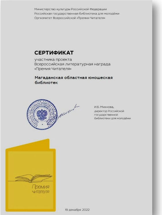 Магаданская областная юношеская библиотека уже третий год  является  участником проекта Всероссийской литературной награды «Премия Читателя». Она вручается на основе анализа читательского спроса в библиотеках страны и финального голосования жюри, состоящего из молодых читателей в возрасте от 18 до 35 лет. Это — единственная библиотечная премия, которая очерчивает круг молодёжного чтения, определяет читательские предпочтения молодёжи. Родилась в стенах Российской государственной библиотеки для молодежи, а сегодня в проекте принимают участие уже 48 библиотек России.