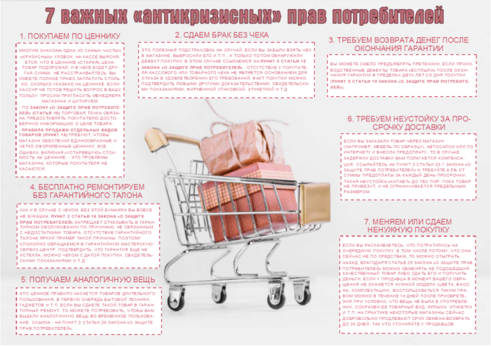 По статистике, каждый второй минимум раз в жизни сталкивается с нарушением своих потребительских прав. Это данные соцопросов, а фактически число пострадавших гораздо больше: многие даже не догадываются, что в некоторых обидных ситуациях вполне успешно можно получить компенсацию или хотя бы избежать потерь. В этой памятке мы собрали самые важные и полезные правила, которые обязательно пригодятся на практике. Они помогут сэкономить деньги, время и нервы в условиях экономической нестабильности.