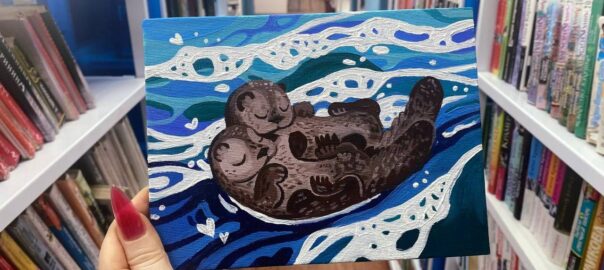Два забавных хищника отправились на речную прогулку. Тихая гладь воды, хорошенькие обнимающиеся выдры со смешными мордочками и необычный маленький формат картины.