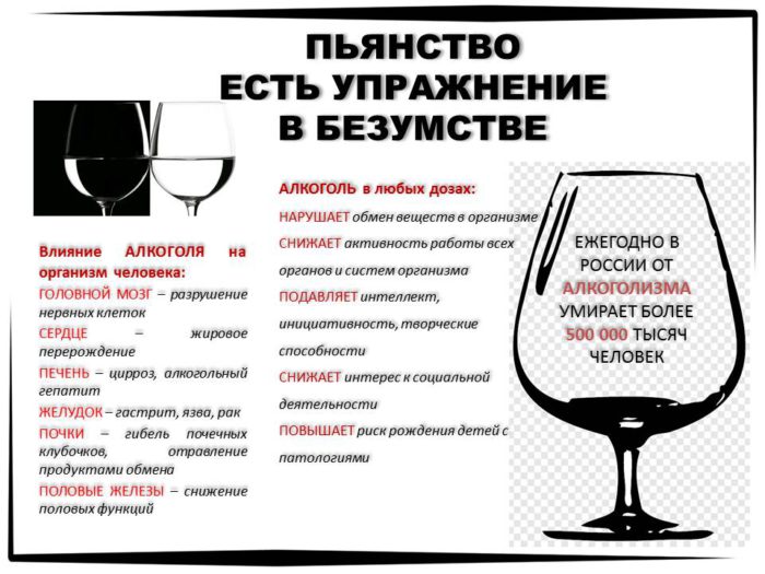Алкоголизм в России сегодня достиг небывалых масштабов. Все, кто позволяет себе бокал вина или пару кружек пива для расслабления после работы или учебы, во время дружеских посиделок или за просмотром спортивных передач, не задумываются о губительном воздействии этанола на физическое и психическое самочувствие и на работу всего организма в целом. Последствия пристрастия к выпивке наглядно показывают всем, даже сомневающимся, что алкоголь вреден для здоровья. Чтобы не подвергать свой организм непосильным испытаниям, важно полностью отказаться от приема губительного зелья. Берегите себя!